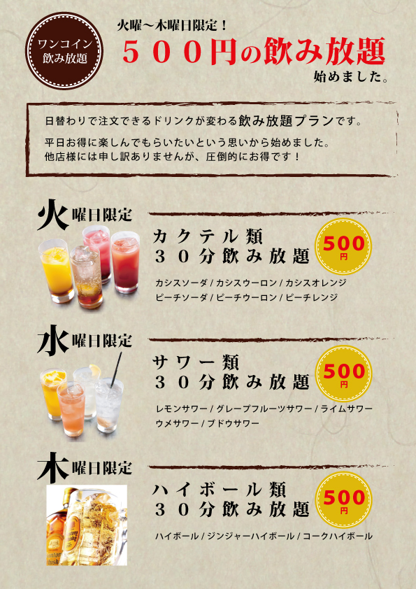 火曜〜木曜日限定で、日替わりで飲み放題を30分500円で提供します。
